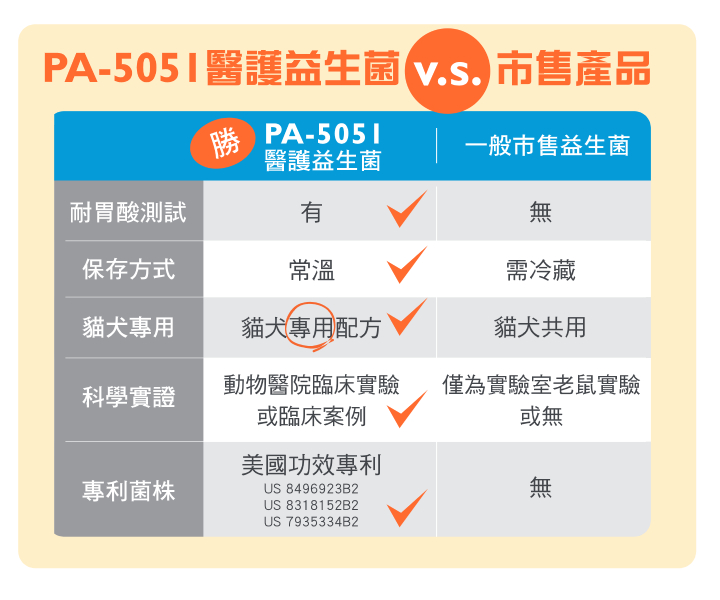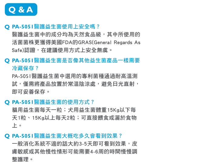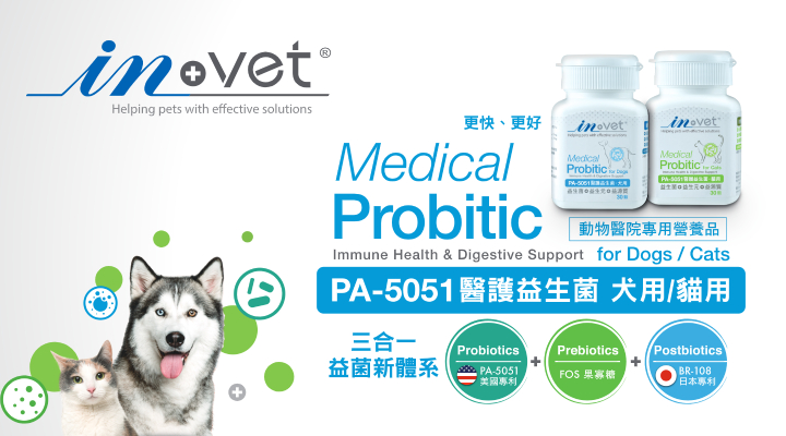 PA-5051醫護益生菌,以科學研究為基礎,專為毛孩們開發的益菌產品。率先使用三合一益菌系統,結合益生菌、益生質及益源質的益處,讓功能更加全面完整。能夠有效照護毛孩們的腸胃道機能、免疫能力、並管理皮膚敏感。對於腸胃皮膚敏感、以及正在進行療程的毛孩們,有著極佳的健康護理效果