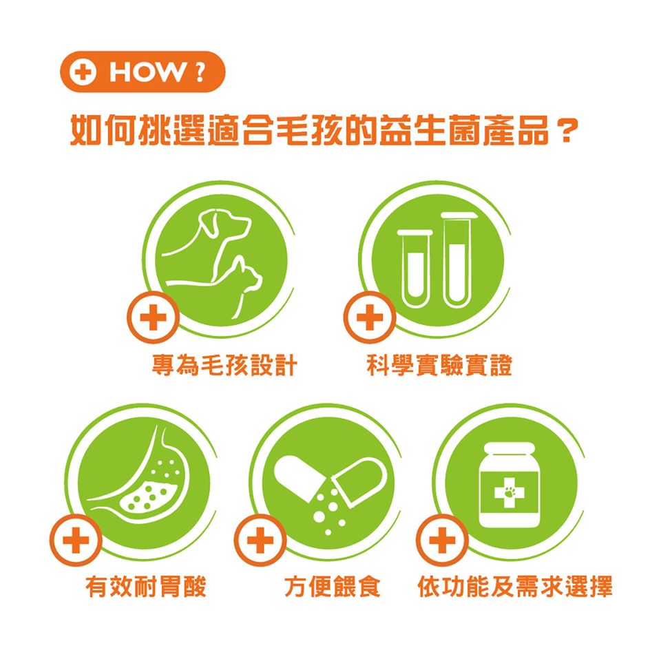 毛孩們身體不適,每個毛爸毛媽想必都心急又不捨。當毛孩健康出現狀況,除了一定要盡快尋求專業醫療協助,也可以在獸醫師的建議下讓毛孩們補充益生菌,護理毛孩的腸道機能及維護免疫能力。